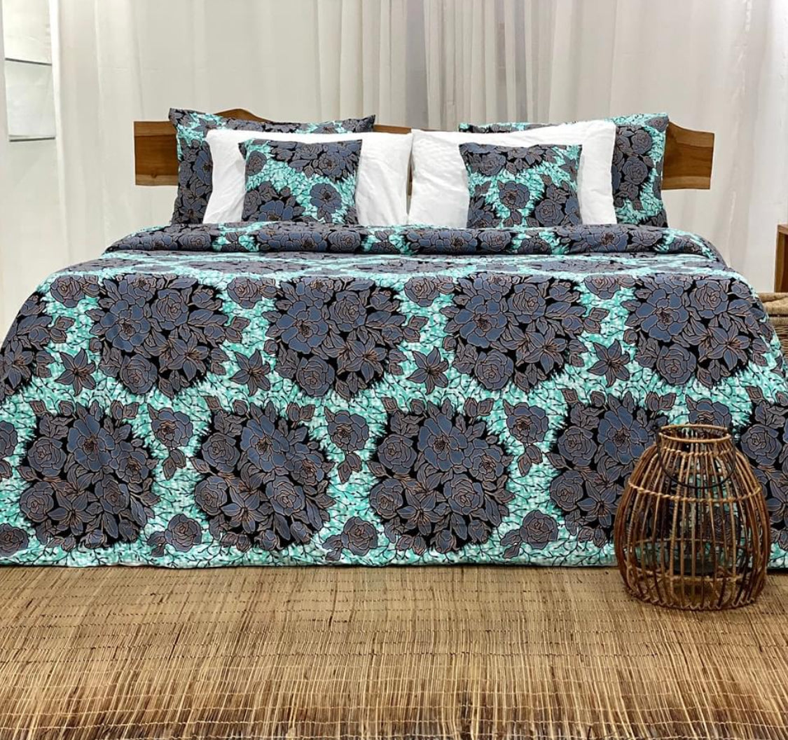 nos parure de lit en wax sont des ensembles de linge de lit imprimé avec des motifs wax, un style d'impression textile typique de l'Afrique de l'Ouest. Les parures comprennent généralement une housse de couette , un drap housse et des taies d'oreiller assortis.