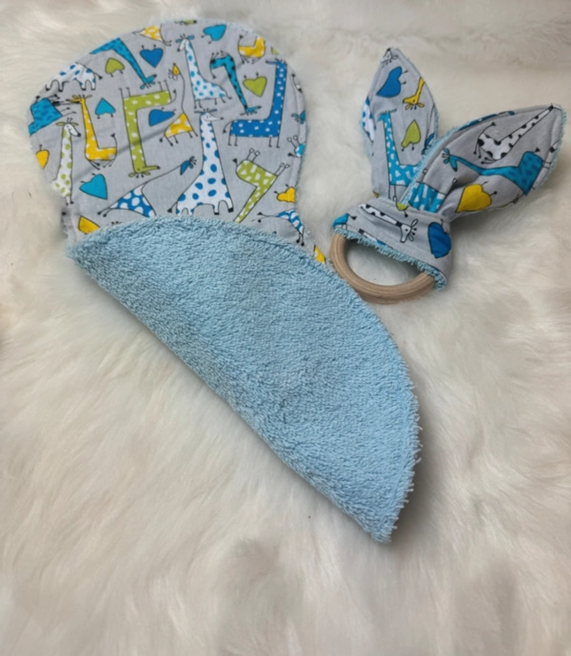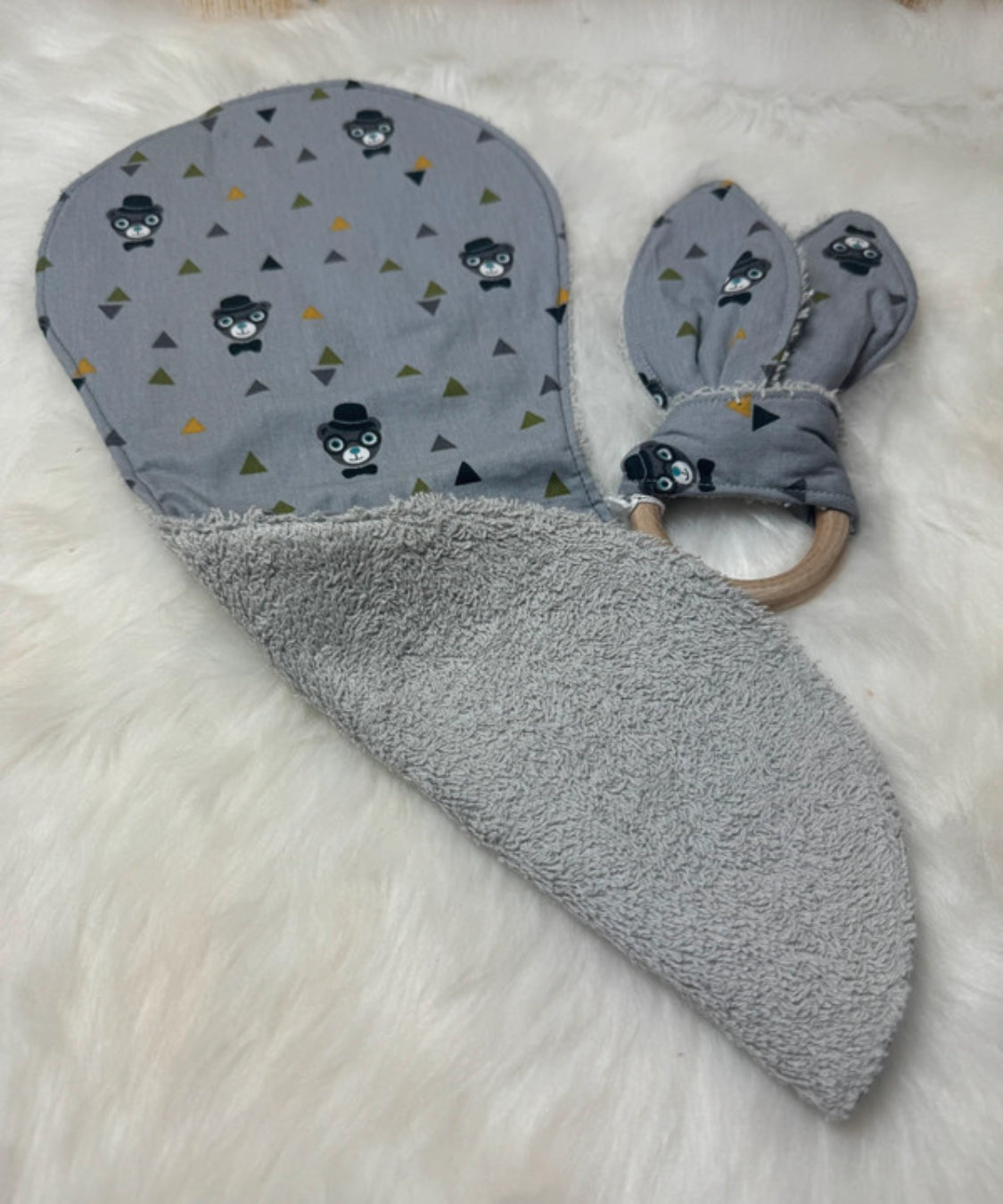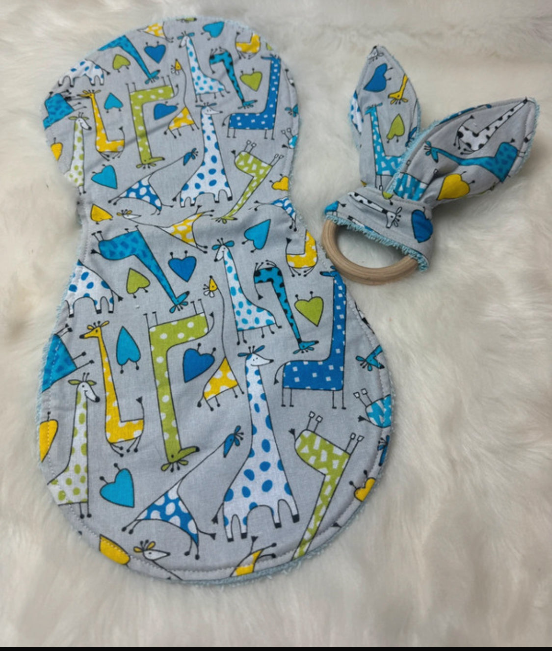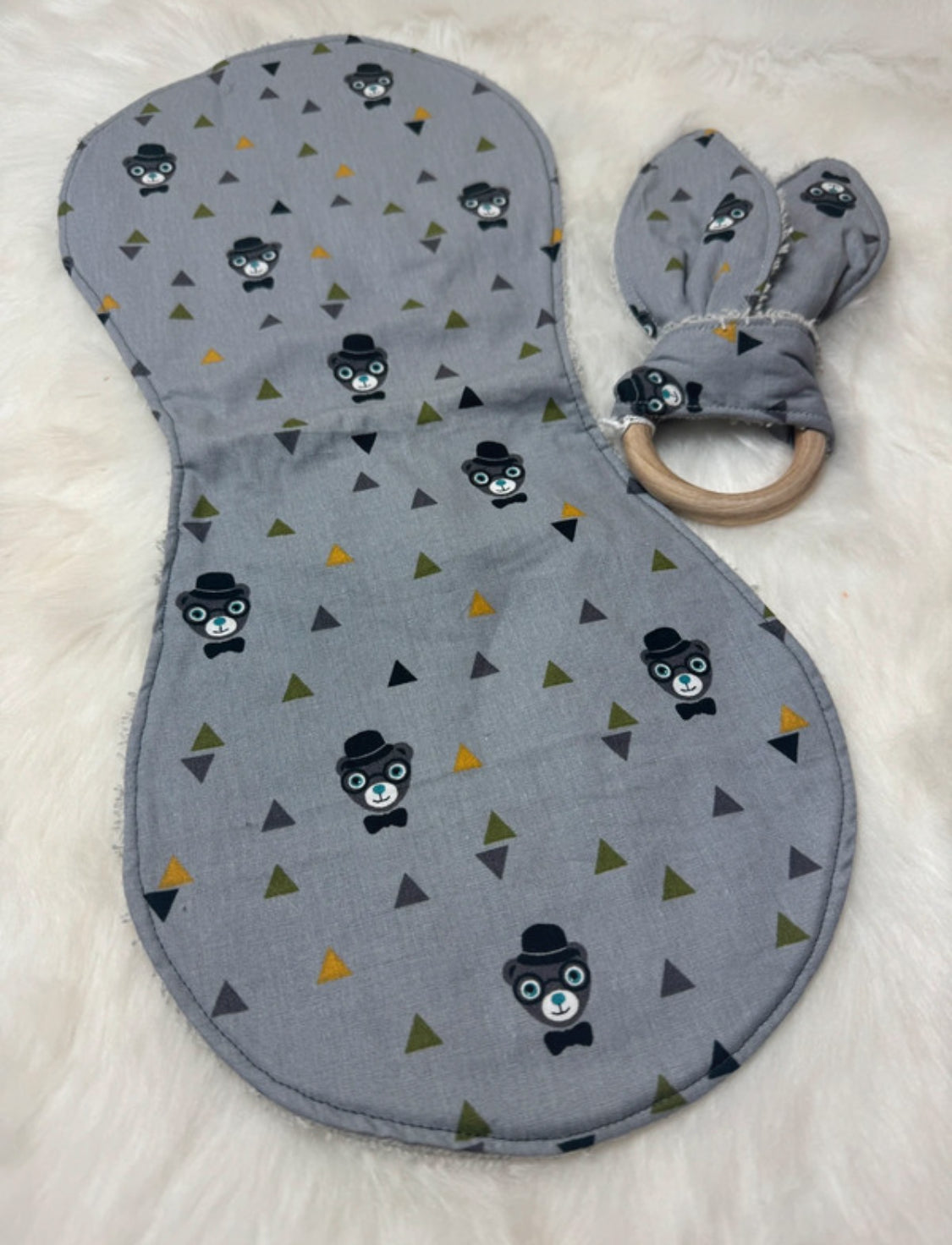 Kit essentiel bébé personnalisé par Ensolewax: bavoirs, rot et anneau de dentition. Fait à la main.