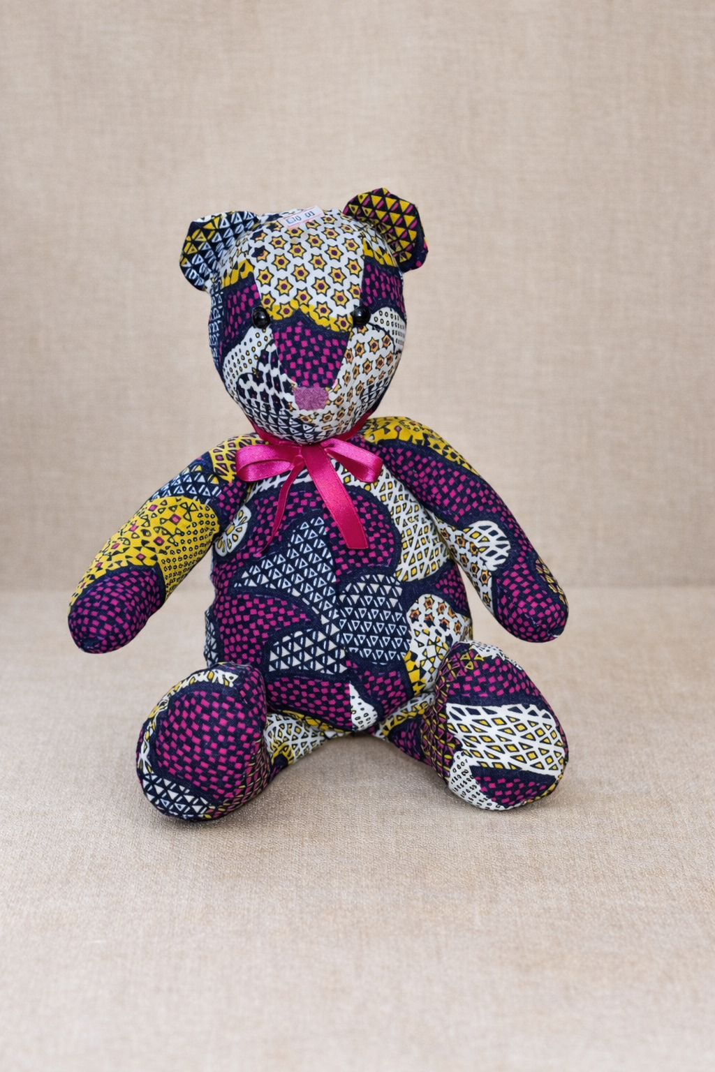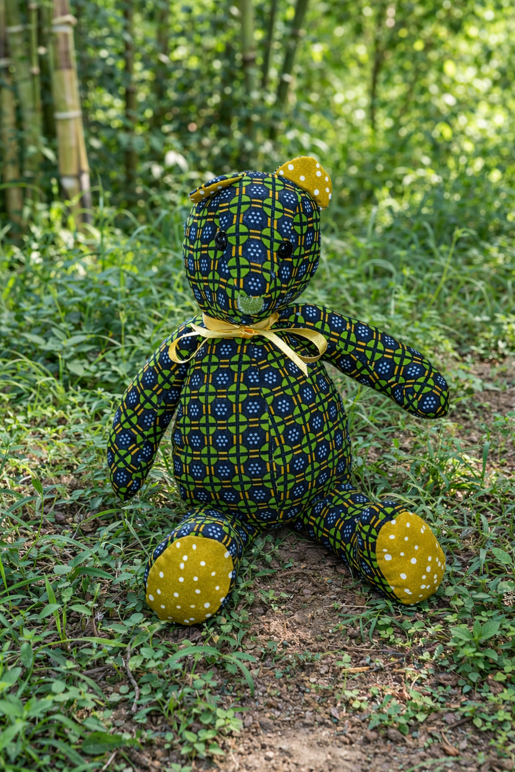 Doudou en wax coloré, fait avec des tissus africains aux motifs vifs. Il est doux, léger et facile à câliner. Ses couleurs jaune, rouge et noir attirent l’attention et apportent de la joie. Un petit nœud autour du cou lui donne une touche mignonne. Idéal pour les enfants ou comme objet décoratif.