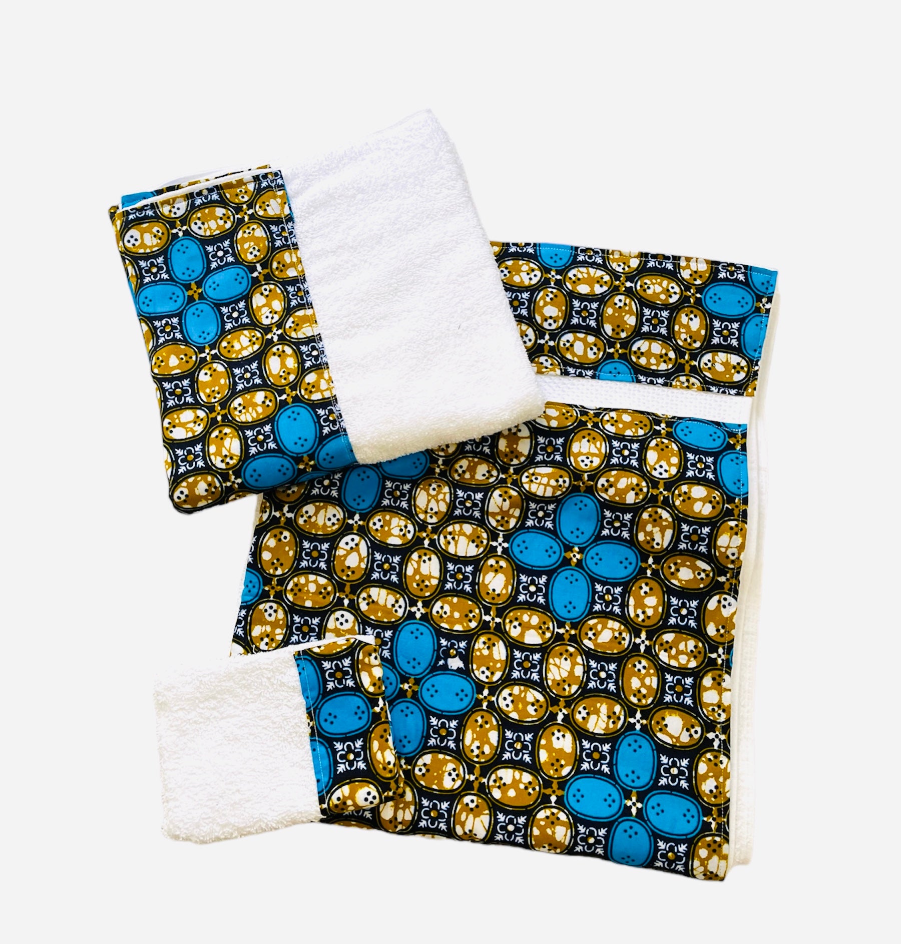 Une ensemble de serviettes customisé avec du tissu wax est une façon élégante d’ajouter une touche de style et de personnalité à votre salle de bain. Le tissu wax, avec ses motifs colorés, apporte une ambiance chic à votre décor. En ajoutant ainsi une touche unique et originale à votre ensemble de linge de maison.